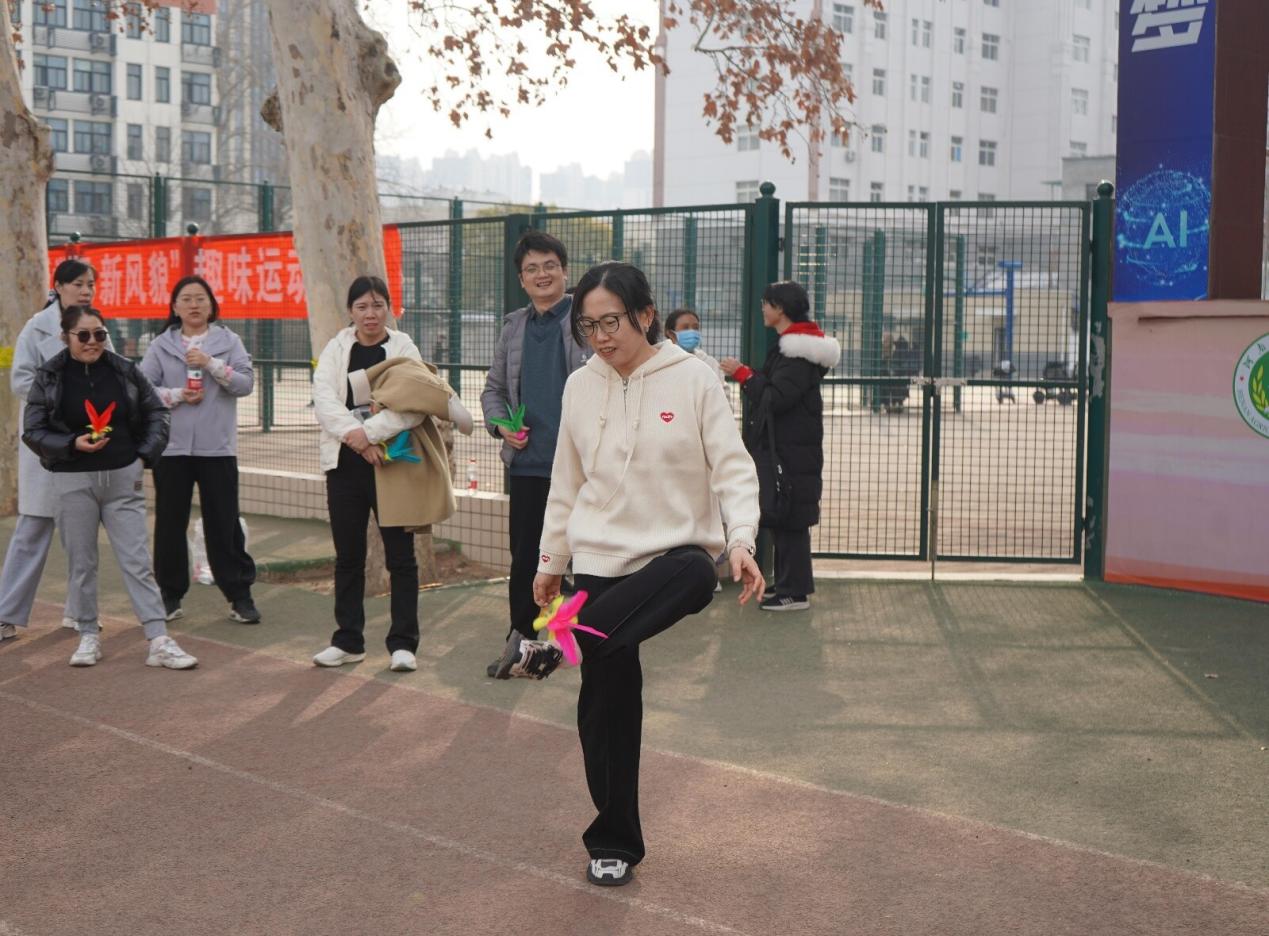 教职工团队的凝聚力和拼搏精神。比赛结束后,前4组脱颖而出,获得了学院准备的毛巾作为奖品,捧着这份荣誉,队员们的脸上洋溢着自豪与喜悦。随后的“踢毽子”接力环节同样精彩,各系室参赛队员配合默契,毽子起落间,你来我往,展现出了里番
