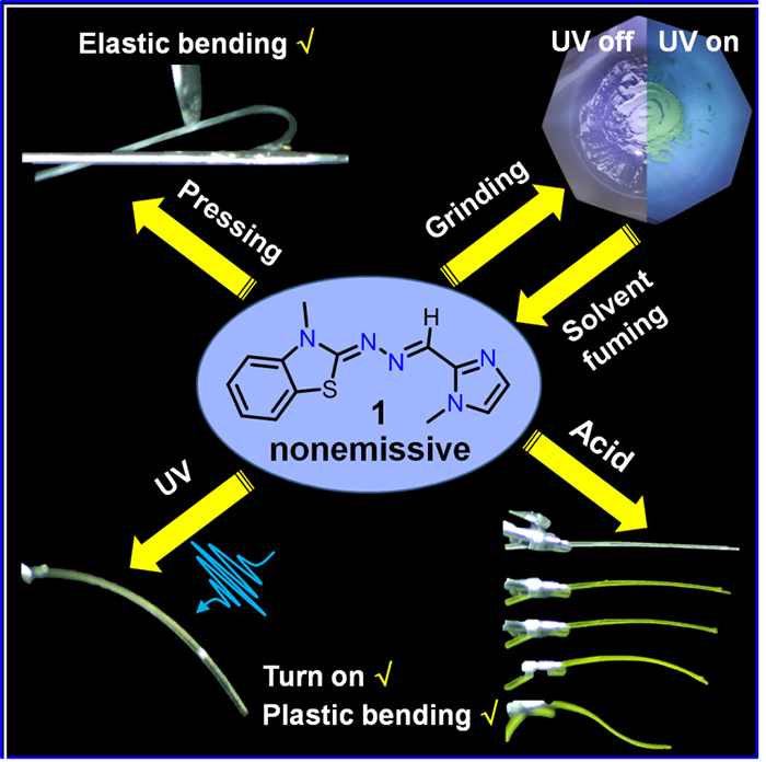 里番 郑昕博士团队以灵活性的腙键为桥,连接苯并噻唑荧光团和咪唑功能基团,构建了一种新型功能分子。在紫外光作用下,这种分子的细长单晶可以发生快速可逆的塑性机械弯曲运动,并在此过程中伴随着显著的荧光增强(图1)。而在机械外力作用下,此柔性单晶还表现出明显的弹性弯曲。此外,在多种挥发性酸蒸汽作用下,此柔性单晶还可以发生可控的塑性机械弯曲和荧光增强,从而解决了酸诱导机械弯曲过程中晶体会发生荧光猝灭的难题(图2)。