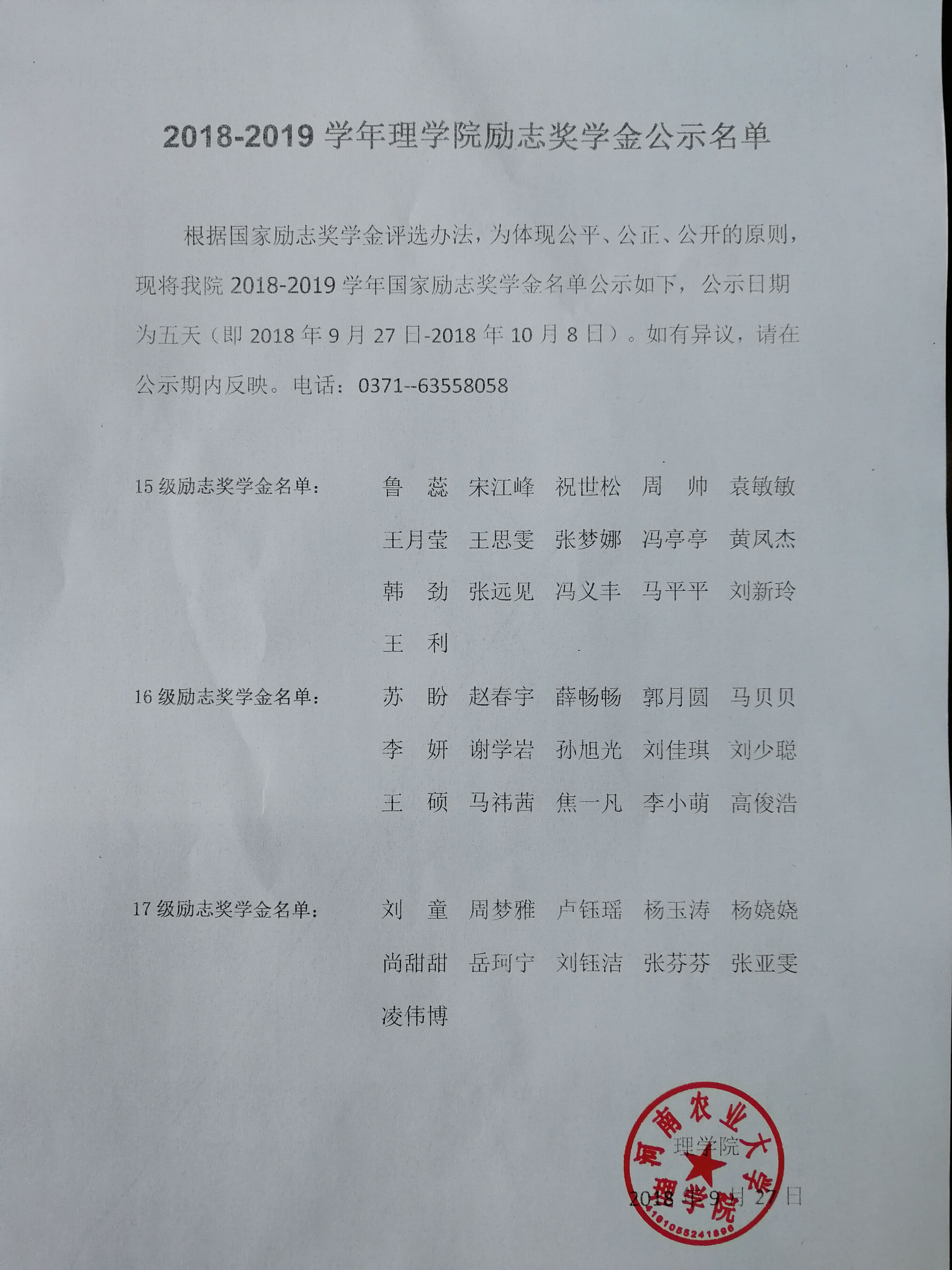2018-2019学年里番 励志奖学金公示名单