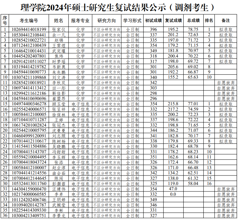调剂考生复试结果公示如下,公示期至2024年4月17日。请对复试结果进行监督。