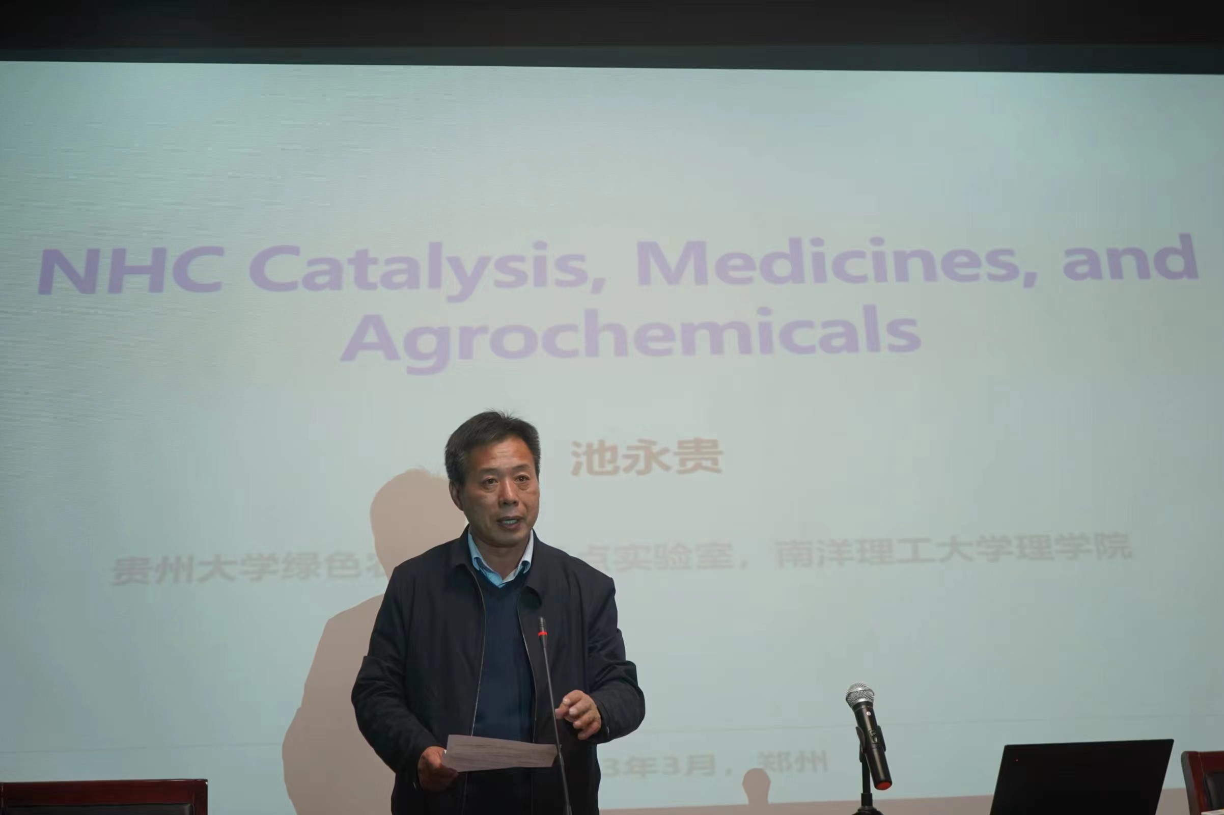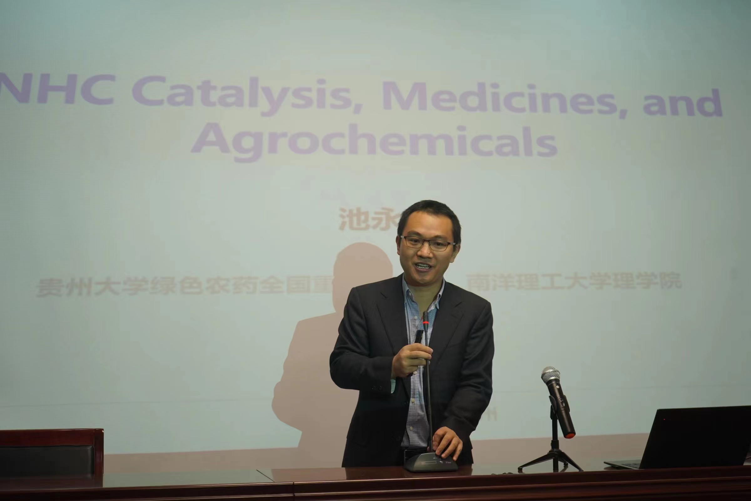 的邀请,南洋理工大学和贵州大学双聘教授池永贵老师,出席我校“两堂两坛”学术文化之格致学术讲堂,为我校师生做了主题为“NHC catalysis,Medicines and Agrochemicals”(利用氮杂环卡宾合成催化剂、医药和农药)的学术报告,本次报告由我校副校长汤继华教授主持,学校相关专业的师生参加了报告会。