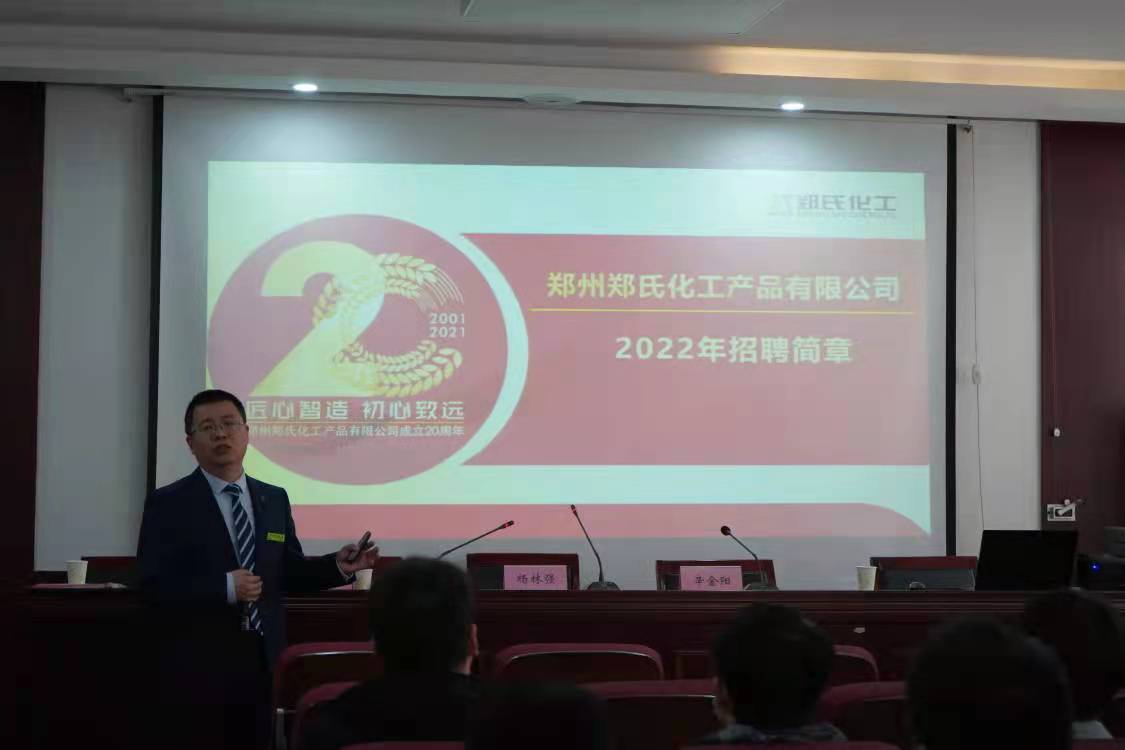 此次招聘会由郑州郑氏化工产品有限公司人力资源部副总杨林强主讲。会议中,杨林强详细的介绍了公司资质、公司总况及其组织架构,列举了公司取得的各项成绩,介绍了公司的顶级专家团队和各种各样的活动,着重介绍了该公司计划招聘的职位及其待遇。里番 2015届毕业生姚红结合自身经历讲解了加入该公司后的收获与成长。最后,杨林强及其随行人员对学生提出的问题进行了详细的解答。