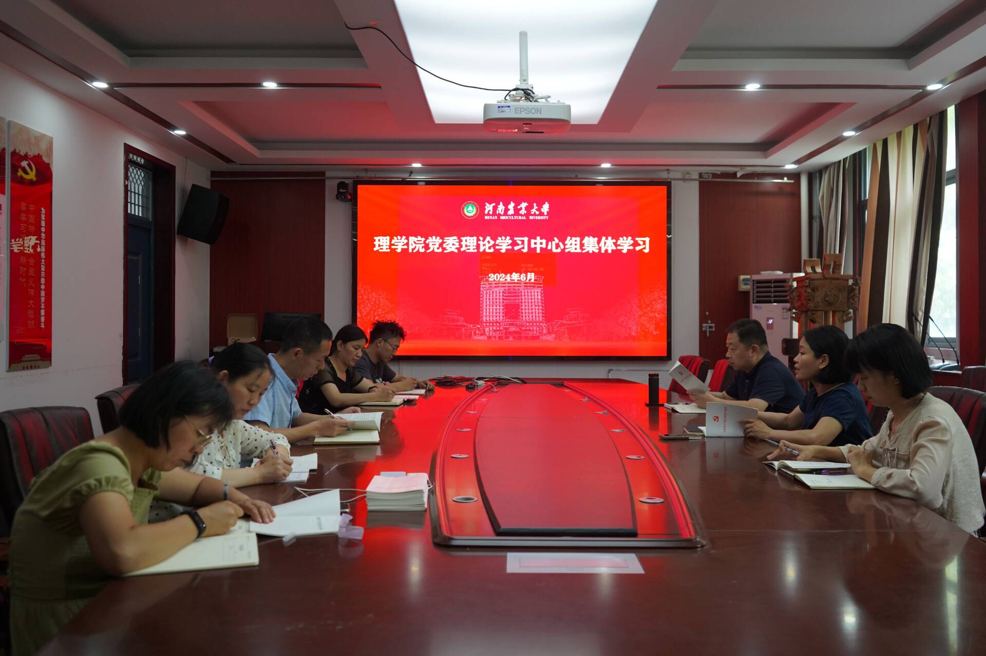 于文化路校区18号楼319会议室进行党委理论学习中心组集体学习,本次会议由党委书记王照兰主持,学院班子成员、党委委员参加会议。