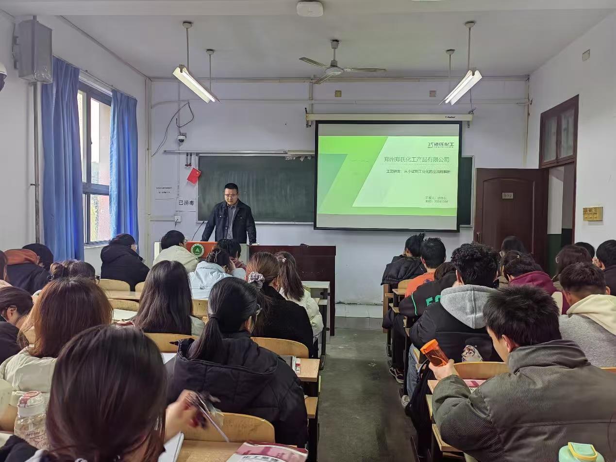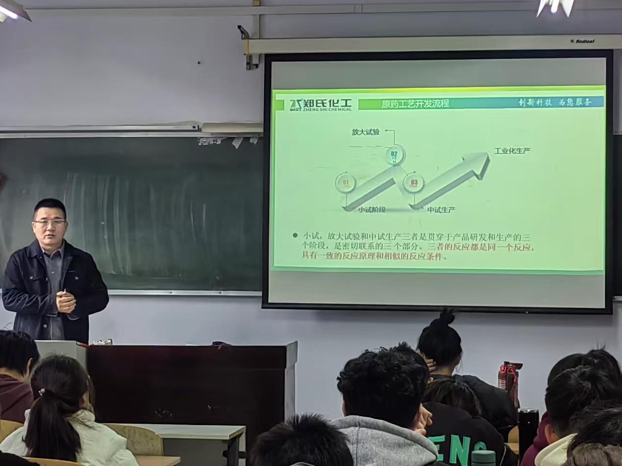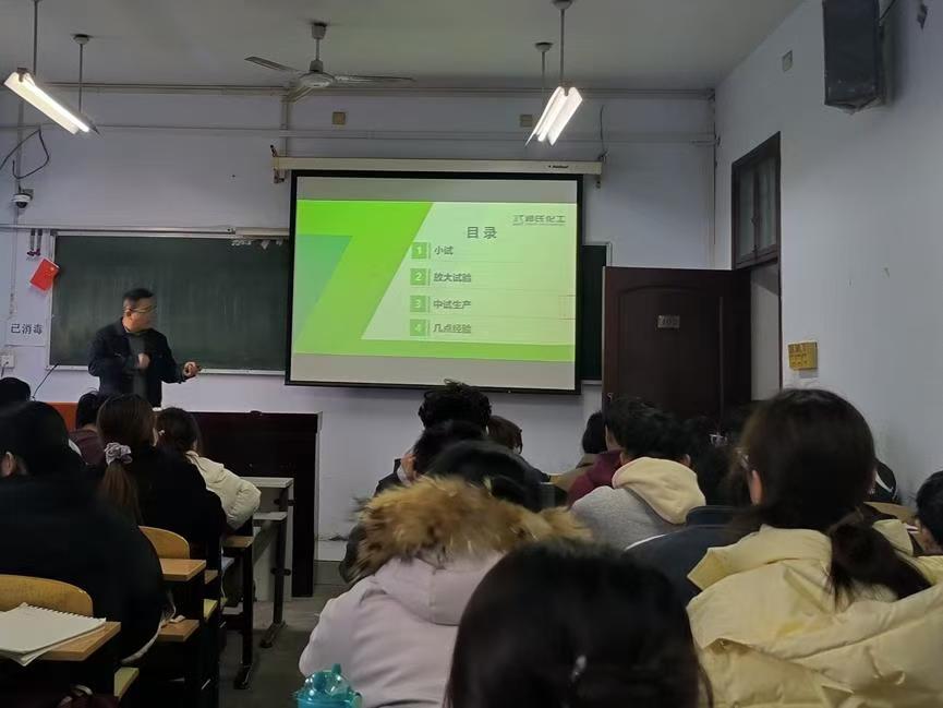 22 级应化专业学生做了关于“工艺研发:从小试到工业化的全流程解析”的精彩讲座。许伟长老师结合企业生产和个人研发经验,就原药工艺开发流程中的小试、放大试验和中试生产等不同阶段的目标、特点、区别和注意事项等进行了深入讲解。