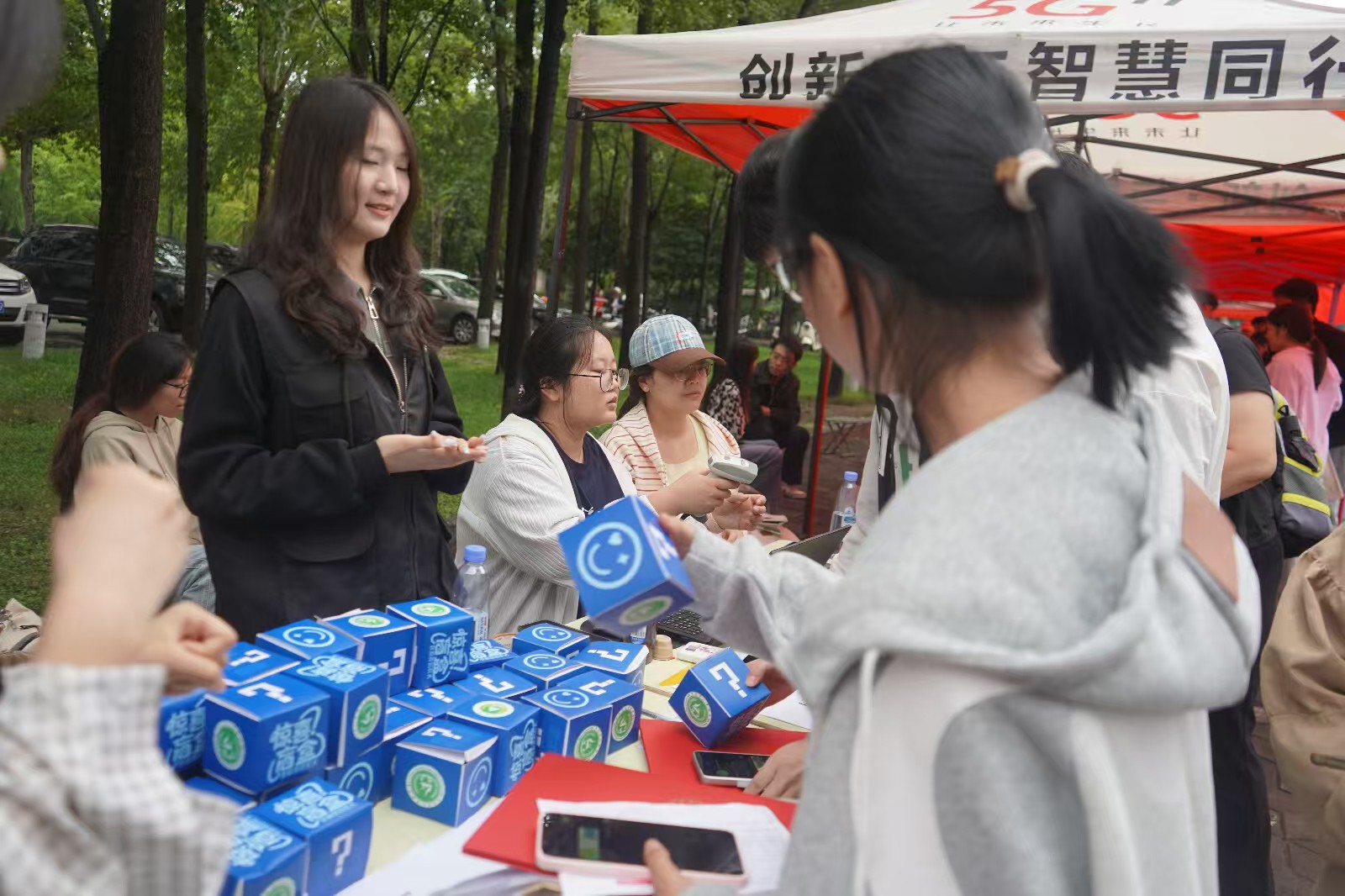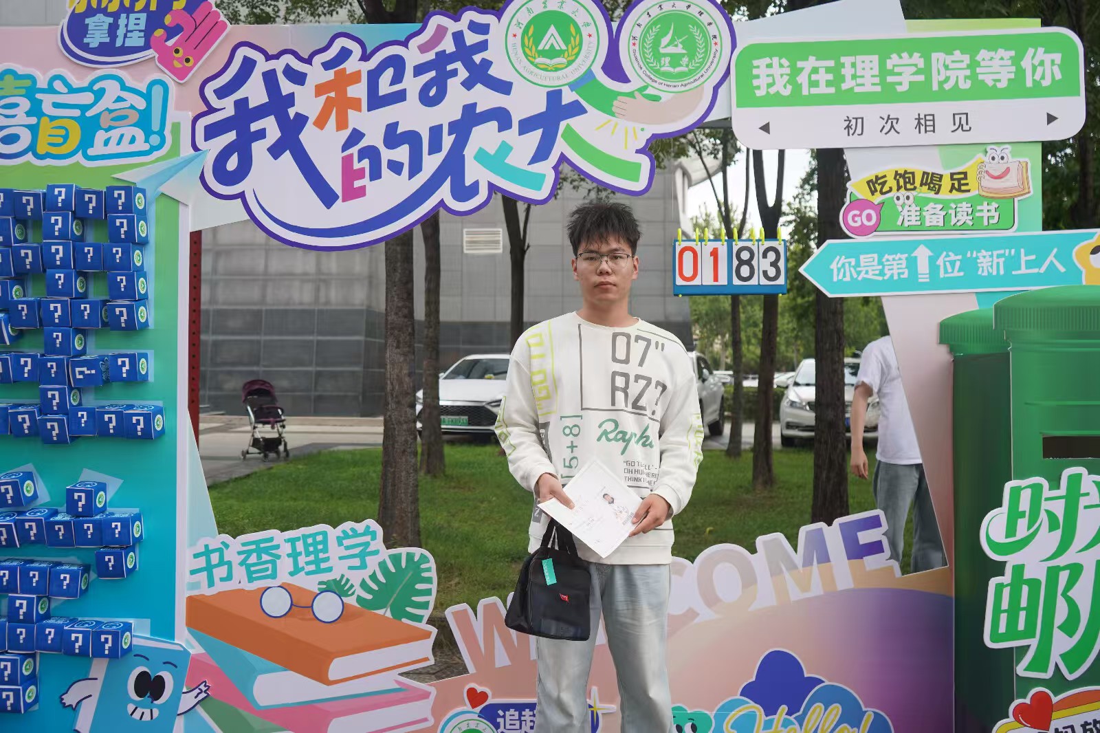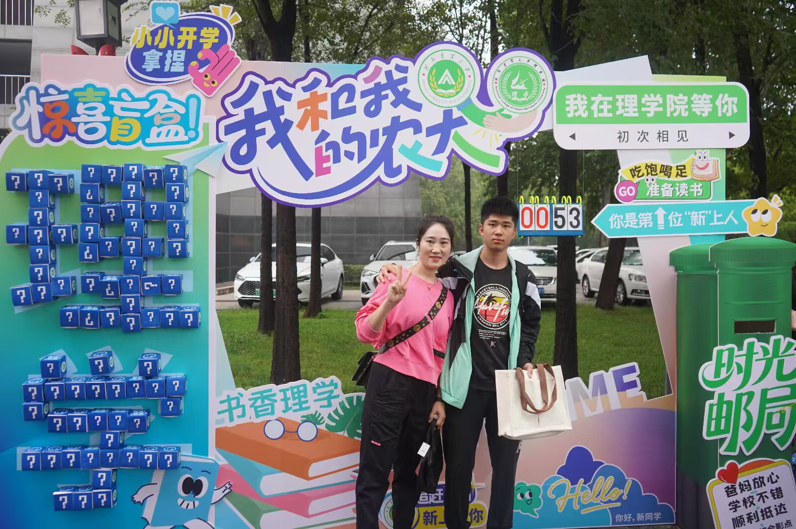 早晨七点,志愿者与助班团队已全部就位,以热情细致的服务迎接每一位新生的到来。为营造温暖有序的迎新氛围,学院设置了富有理学元素的迎新展架作为新生专属留影区,并通过实时翻动的计数牌准确显示报到人数,为每位新生拍下入学第一张照片,留下大学初见的仪式感。现场还布置了“理学时光邮局”,提供定制明信片和实体邮箱,新生可在此书写寄语、投递未来。学院更以数百份盲盒精心拼出“理学”字样,每份盲盒内含生活用品、零食、定制院徽及纪念胸章等随机礼品,既彰显创意,又传递惊喜,陪伴新生开启探索之旅。此外,学院还为每位新生准备了定制手提袋,内赠《习近平与大学生朋友们》一书,寓意书香启航、理想相伴。迎新现场互动积极、气氛热烈。