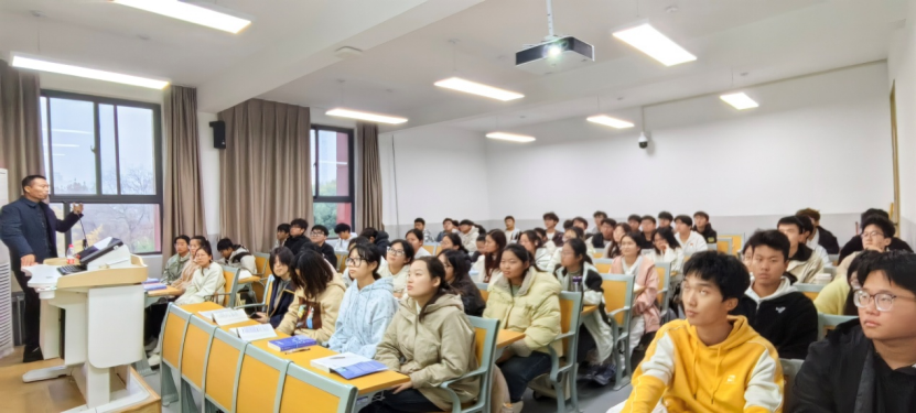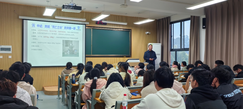 郭少征博士指出实验室成功≠生产成功,在实验室烧瓶里行云流水的反应,到了工厂大釜就可能“水土不服”,收率暴跌、杂质飙升,甚至安全事故频发… 这中间的鸿沟,被业内形象地称为“死亡之谷”。合成工艺研发,远不止是找到一条能走的路线,更重要的是打造一条能稳定、安全、经济地从实验室通向大规模生产的桥梁。郭博士从小试:工艺的“筑基期”,中试:跨越“死亡之谷”的关键一跃,放大:商业化生产的“决胜局”等方面,结合具体案例深入浅出的讲解,得到了同学们高度的好评。同时,他鼓励同学们在校努力掌握专业知识和实验技能,假期多实践实训,多渠道积累创新创业经验和方法,为提升创新能力和就业竞争力打下坚实基础。