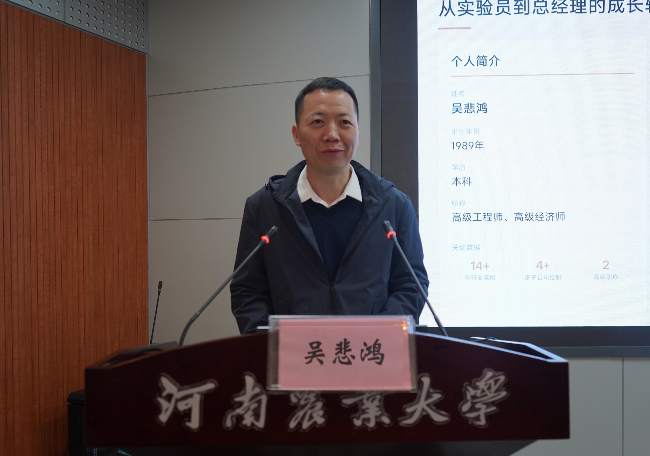 在文化路校区100人报告厅开展校友讲座暨企业招聘宣讲会,特邀优秀校友、濮阳惠成电子材料股份有限公司总经理吴悲鸿担任宣讲嘉宾。