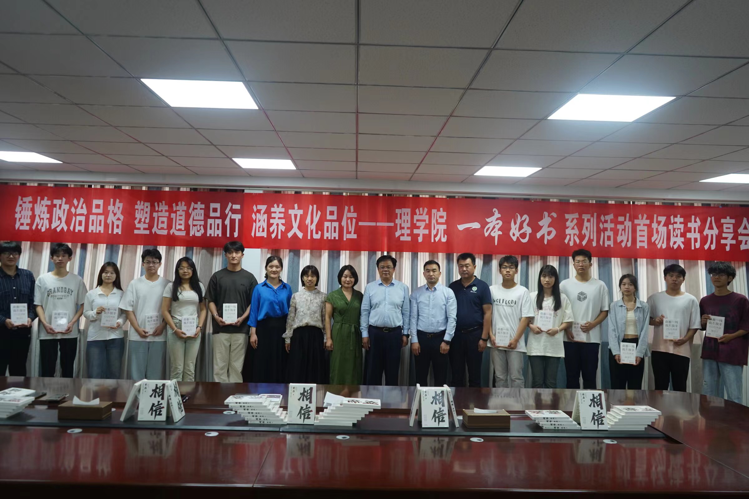 贾云飞等其他几位老师解答了学生提出的读书及学习方面的困惑。最后,各位嘉宾和老师将下一期推荐的好书《命悬一线 我不放手》赠予各位学生代表并合影留念。