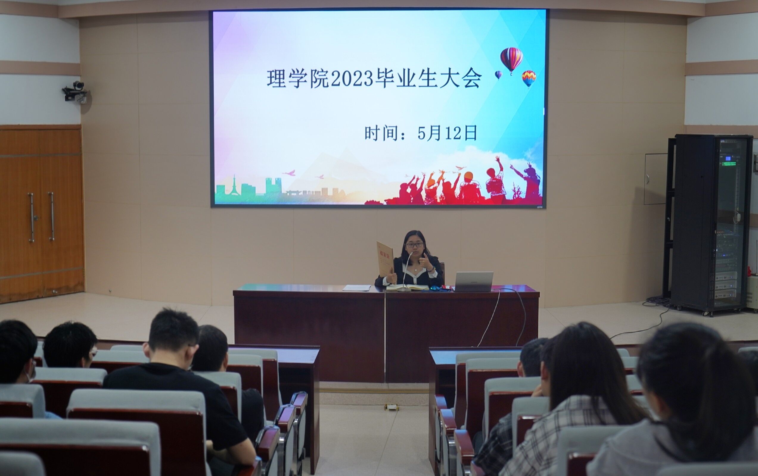 在文化路校区三百人告厅举行2023届毕业生大会。团委老师王美丽、2023届本科毕业生参加会议。会议由院团委书记邓瑛主持。