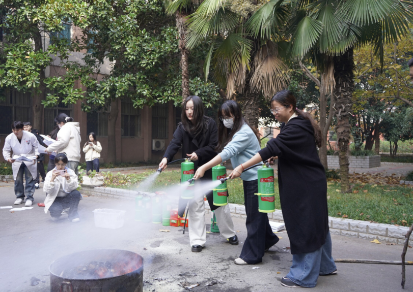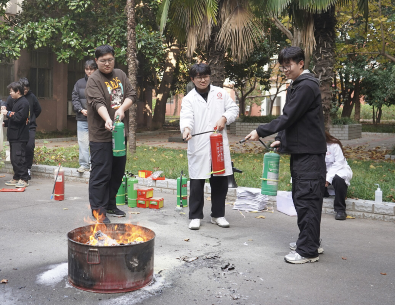 演练现场,学校保卫处刘爱民老师和实验室安全负责人曹占奇现场进行了规范讲解与演示,详细阐述了灭火器“提、拔、握、压”的操作要领及灭火毯的正确使用方法。在明确操作规范后,参训师生分组进行了模拟灭火训练。整个环节组织有序,互动热烈,切实将“预防为主,防消结合”的理念,转化为了人人可上手、人人能应急的实战能力。